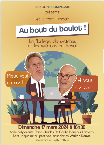 Dimanche prochain, le 17 mars, à 16h30 Ă la salle polyvalente de PlonĂ©our-Lanvern (salle Ă droite quand on est sur le parking face Ă la mairie). Après avoir bien ri, nous pourrons Ă©changer autour d’un verre.