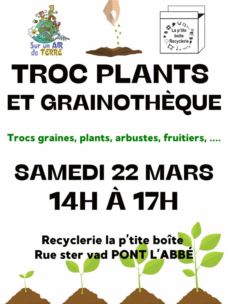 L’association Sur un Air de Terre et la Recyclerie P’tite Boîte vous invitent à un Troc Plants le 22 mars ! Venez avec vos graines, boutures, semis ou plants en trop et repartez avec de nouvelles variétés pour embellir votre jardin ou votre balcon.